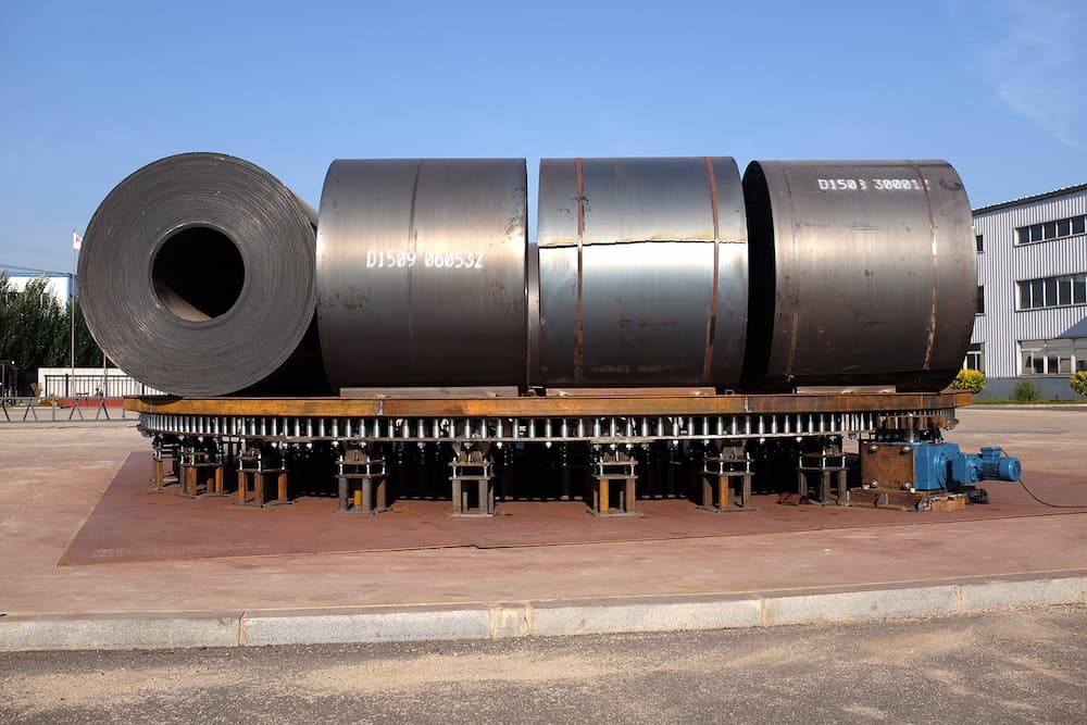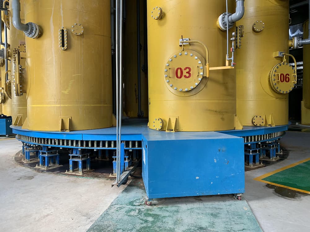 The engineering requirements were rigorous: the turntable had to reliably rotate ten 30-ton cylindrical tanks simultaneously. To ensure absolute structural integrity, Weizhong’s engineers utilized a reinforced modular steel frame and our patented Pin-Gear drive system. This technology is uniquely suited for mega-load scenarios, as it provides positive engagement that minimizes wear and backlash even under extreme high-torque conditions.